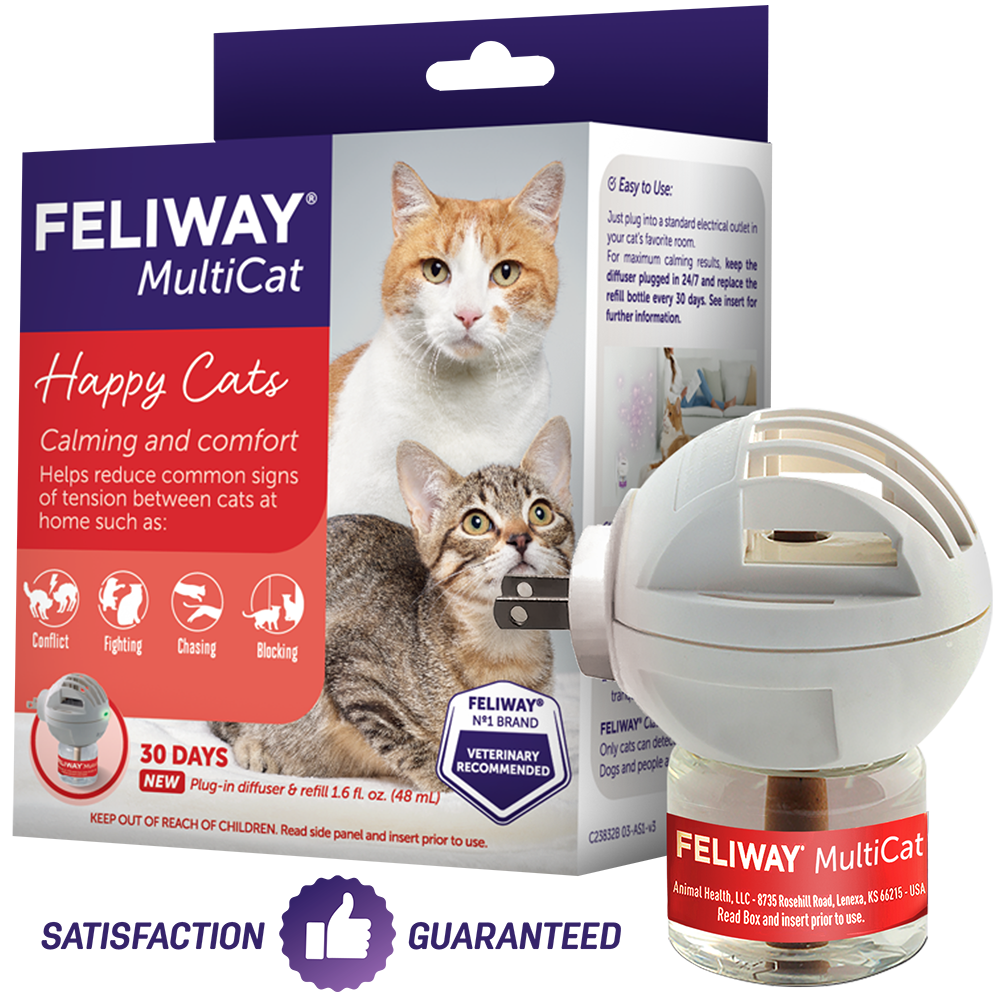 FELIWAY® MultiCat mimics the natural cat appeasing pheromone. It eases inter-cat conflicts and tensions by sending ‘harmony messages’ to cats. These 'harmony messages' reduce issues such as fighting, hissing, chasing and other tensions.